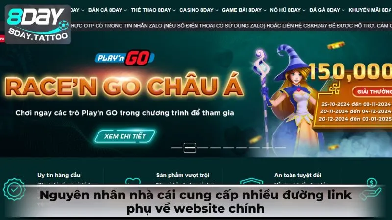 8Day cung cấp cho khách hàng của mình nhiều đường link dẫn dự phòng nhằm giúp khắc phục tình trạng bị chặn link bởi các nhà mạng Việt. Việt Nam vẫn là nước chưa hợp pháp hóa các vấn đề liên quan tới dịch vụ cá cược nên đôi khi hội viên sẽ gặp phải vấn đề bị chặn bởi các nhà mạng lớn trong nước.